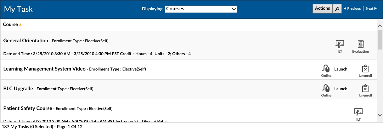 For clients without a specialized landing page, the My Courses Tab in Simple View mode will be the first screen that is displayed. It will provide a tabular listing with graphical icons of all classes the user is enrolled in. It will also allow them to launch online course, view and download attachments, take online tests, complete online evaluation and cancel self-enrolled courses. This page is also accessible by clicking on the My Courses Tab in the Simple View.
