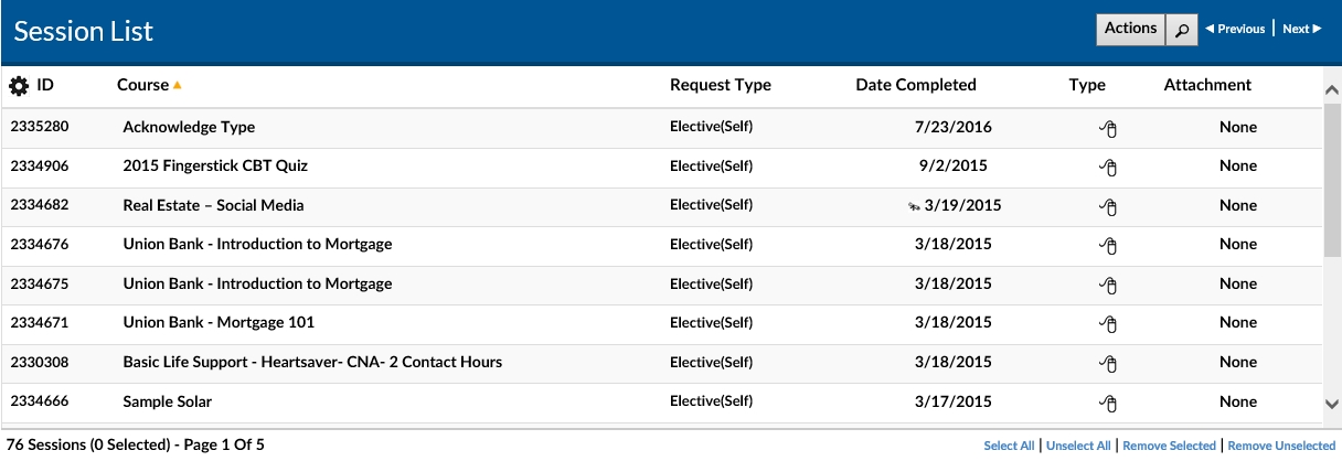 - ID This is the unique identifier for a session record in the LMS. This number is assigned by the LMSsystem when a session record is created.