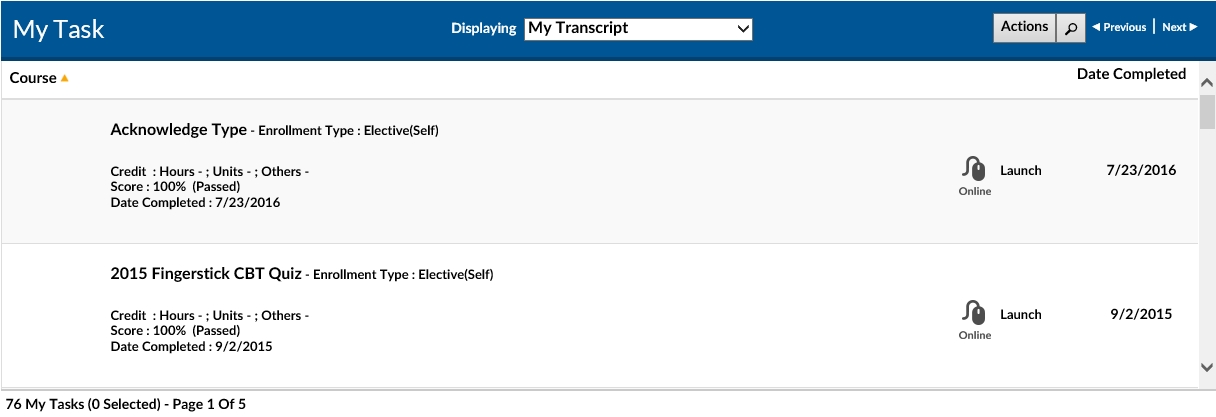 The My Transcript window displays a list of all previously completed courses and dates of completion. Information is stored on the My Transcript page indefinitely. Courses that have been completed by the user will never be removed from their transcript.