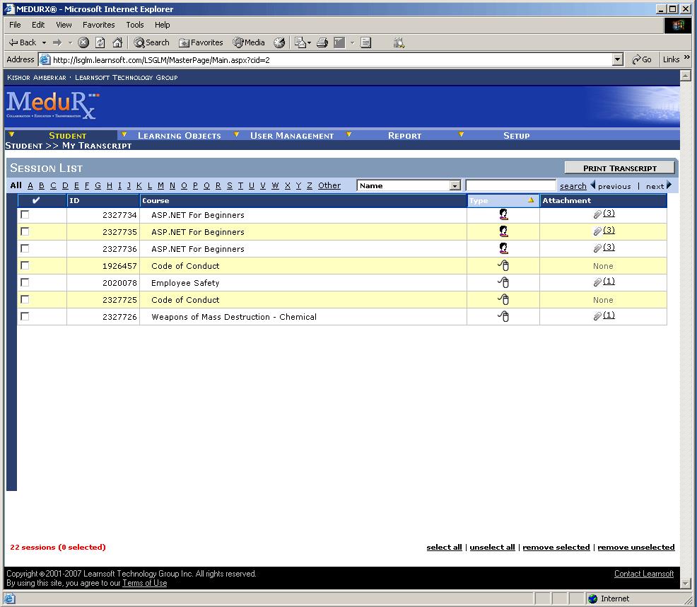 - 4 Close the window by clicking the X in the top right corner System returns to the Sessions Page of MY TRANSCRIPT