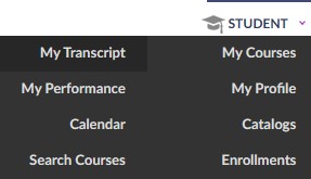 To access the My Transcript Screen, In the Advanced View, hover over the Student drop down menu and select My Transcript.