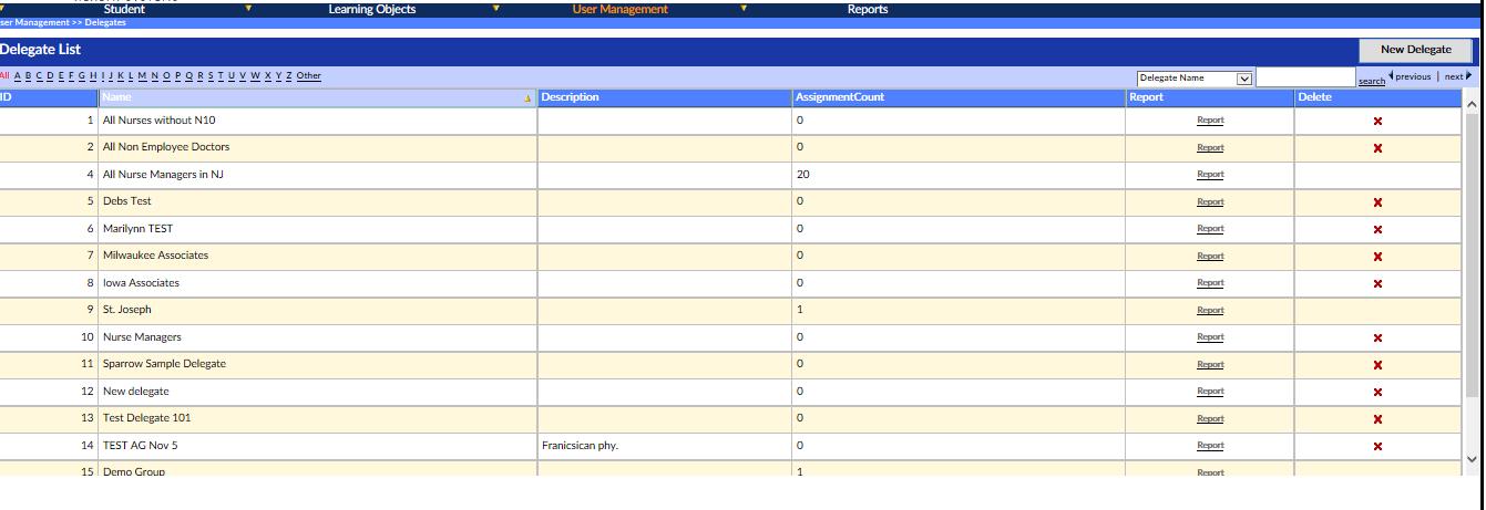 This will bring you to the Delegate List page where you can view, edit, delete existing assignments and create (and schedule) new Delegates.