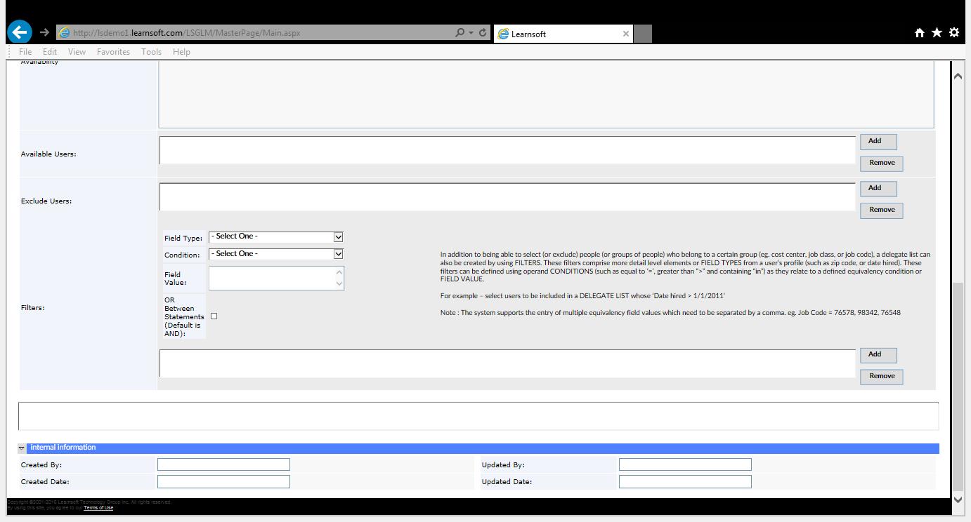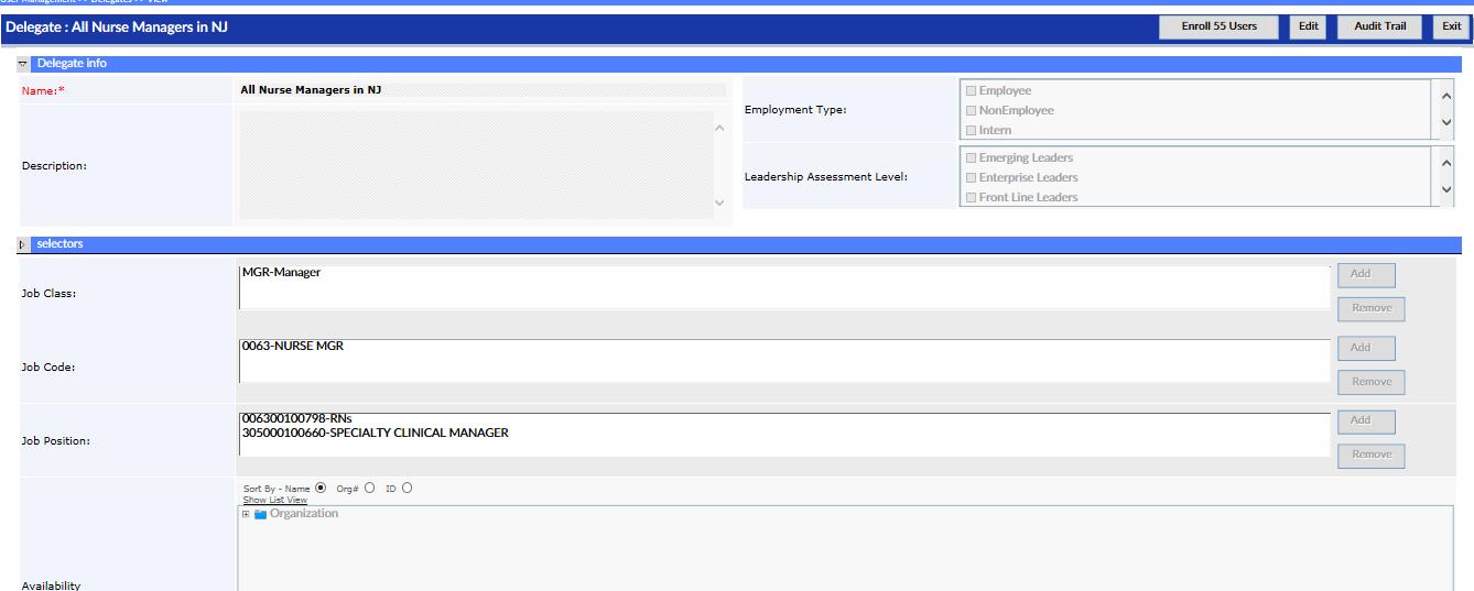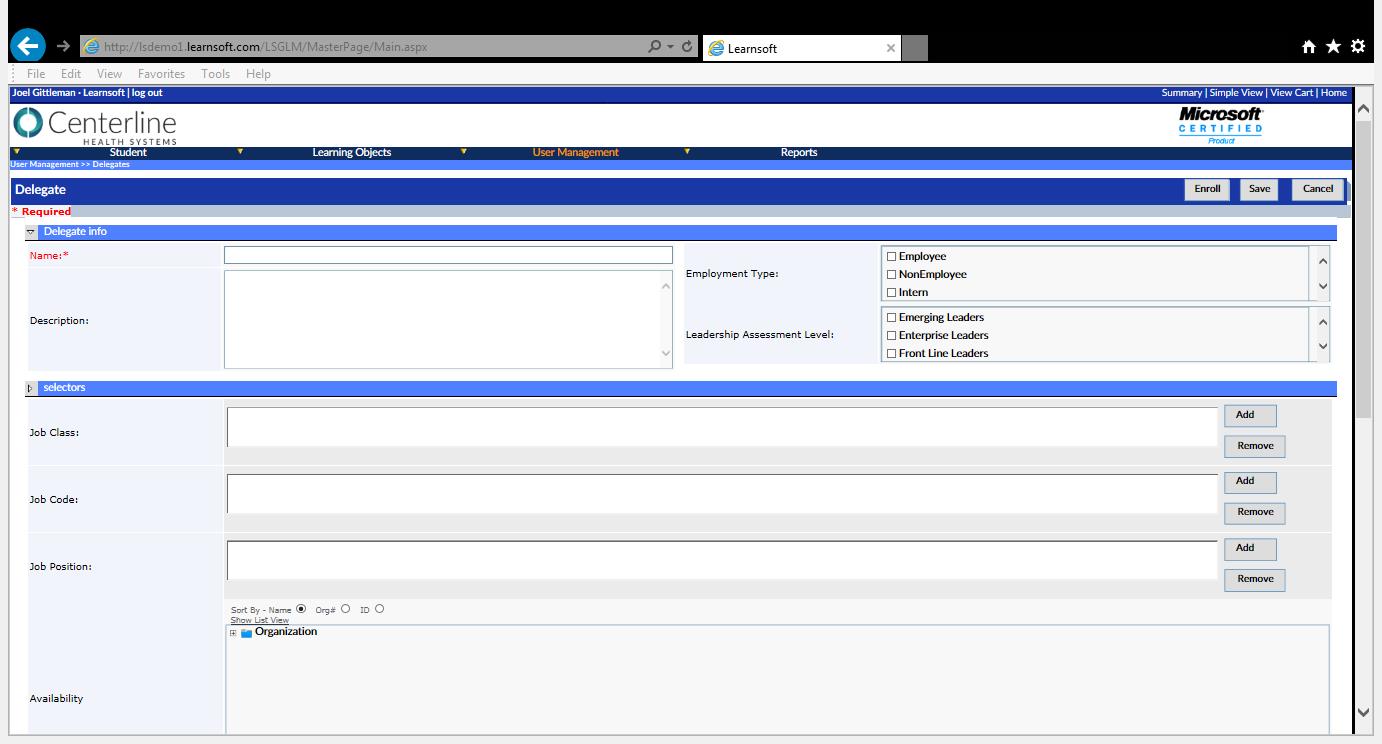 In the Learnsoft LMS, a Delegate is similar to a distribution list in an email system. Delegates allow the creation of reusable groups of targeted users that can then be quickly added to courses, assignment and reports. As importantly, they allow for a level of filtered targeting the other sections are unable to offer.