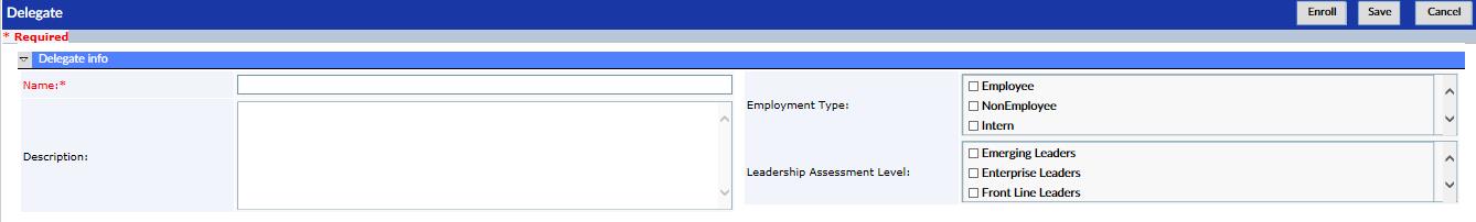 The Delegate info section of the Delegate Details page lets you name and describe the Delegate list to be created and determine if the delegate list should be associated with specific employment and leadership levels.