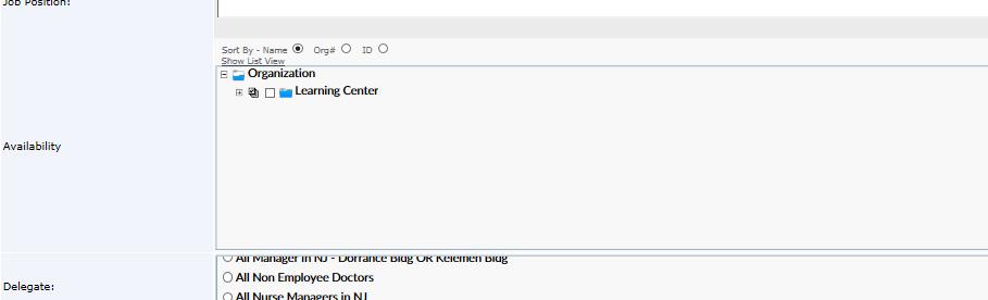 The Availability selector, which uses a tree structure and usually represents some type of company organization chart, allows the creator to specify which parts of the organization to include in the Delegate list. The Availability tree is automatically built based upon data imported into the LMS as part of the User Import service which runs daily. The definitions are usually established as part of the initial LMS installation and deployment process (Please contact your project manager if changes to the Availability tree structure are required).