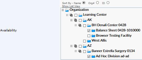 Screenshot 10- Selectors section- Availability (Organization Tree) selector EXPANDED - With specific divisions selected