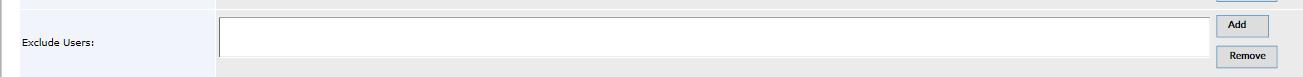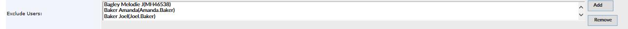 Users may be removed by first highlighting the specific selected Exclude User to remove and clicking the Remove button (While items can be added in bulk, they must be removed individually).