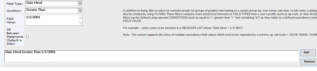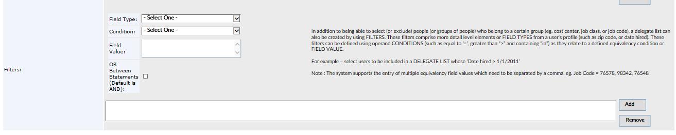 In addition to being able to select (or exclude) people (or groups of people) who belong to a certain group (e.g. cost center, job class, or job code), a delegate list can also be created by using FILTERS. These filters comprise more detail level elements or FIELD TYPES from a user's profile (such as zip code, or date hired).
