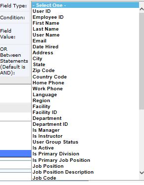 Field Types represent variables that are typically found in a User’s profile and usually generated by the company’s HR system and imported into the LMS system as part of the daily User Import service. The detailed level of Field Type in the filters section is far greater than those available in the above selectors sections or in similar distribution features, such as reports or assignments, allowing for greatly detailed selection.