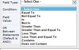 These filters can be defined using operand CONDITIONS (such as equal to "=", greater than ">"and containing) as they relate to a defined equivalency condition or FIELD VALUE.