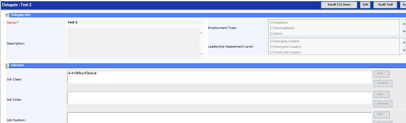 The Job Class, Job Code and Job Position selectors allow the creator to specify a particular job class / codes / positions or groups of job classes / job codes / job positions to include in the delegate. Job Class, Job Code and Job Position information is usually provided by the company’s HR system and associated with individual users and updated within the LMS as part of the User Import service which runs daily.