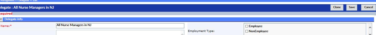 • Employment Type - Part of the Scope Process. Allows the creator to limit the delegate to users meeting a specific employment type or types from those predefined for your organization (e.g. Full Time Employees & Interns).
