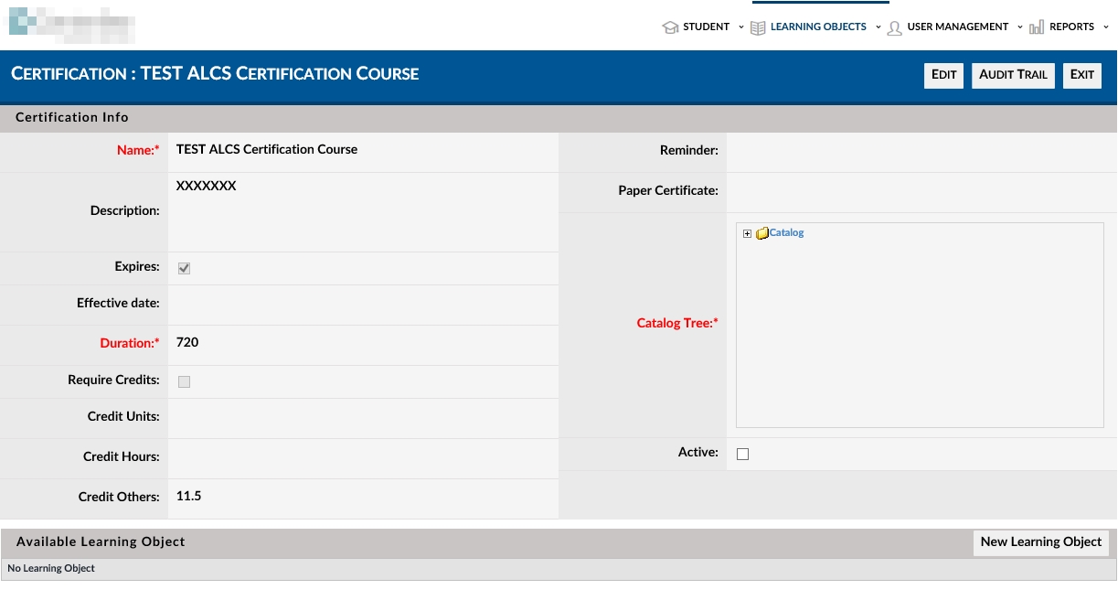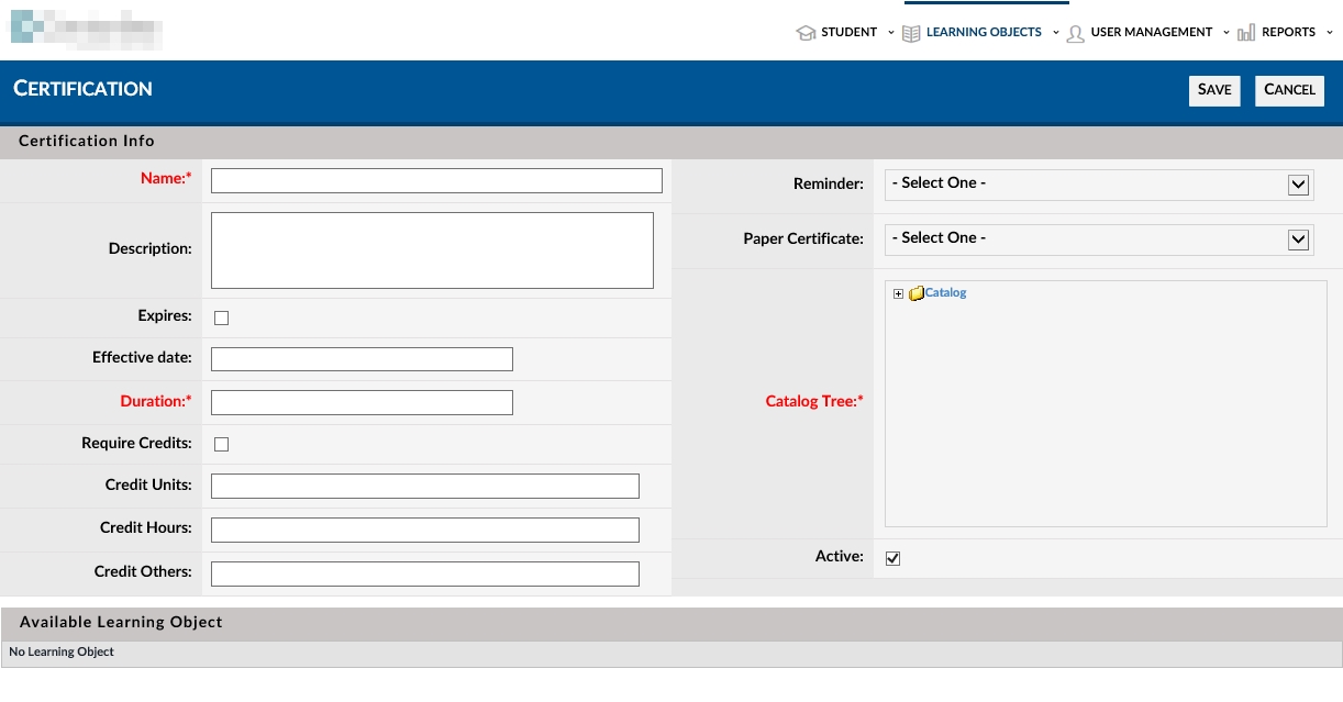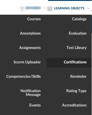 Each specific Certification is created using the Advanced View > Learning Object Drop Down menu (and selecting “Certifications”). Each Certification will require a name, duration and a location in the catalog tree. Optional attributes can store descriptions, required credits to obtain certification, expiration and reminder and associated paper certificate information