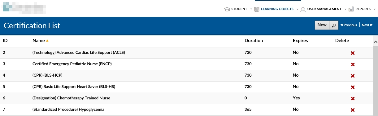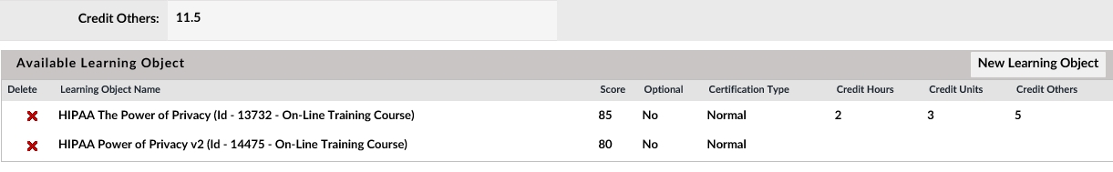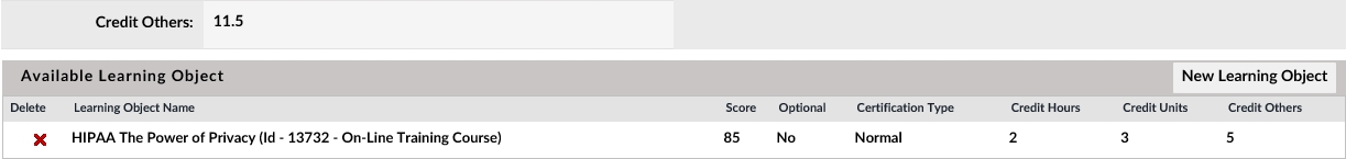 This will bring you back to the Certifications Detail page where you will notice that the new course now appears in the Available Learning Objects Section (You can delete by clicking on the red x and confirming)