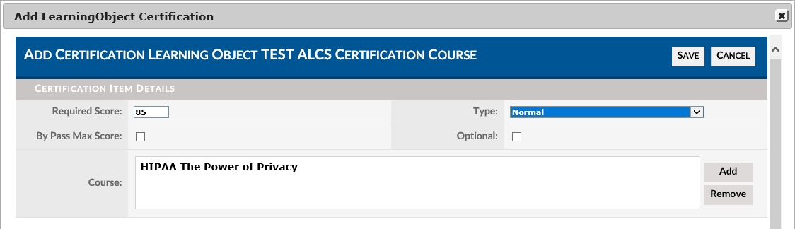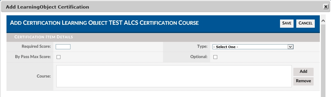 The Learning Object Lookup pop-up page will now close and the Certification Item Details pop-up page will again be viewable. This time, the course will show in the Course text box