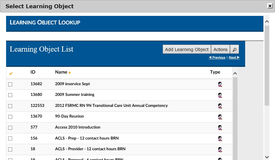 1. Click on the Learning Objects Dropdown Box